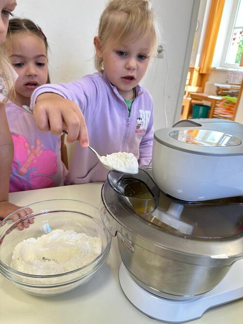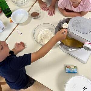 Zusammen mit dem pädagogischen Personal lernten die Kinder, wie man Eier aufschlägt, Zucker und Mehl abwiegt und machten sich mit den Besonderheiten einer Küchenmaschine vertraut.