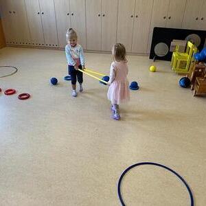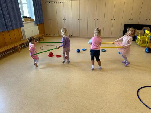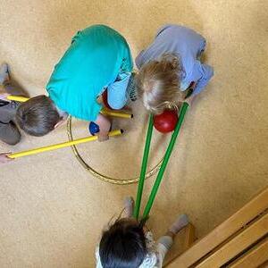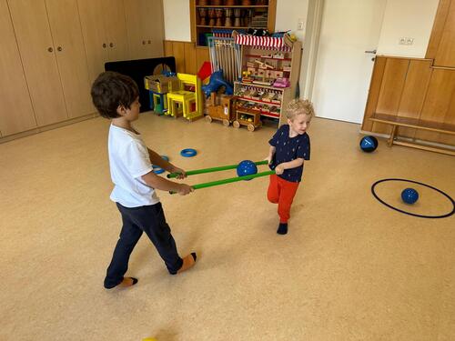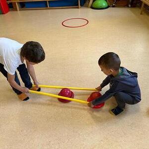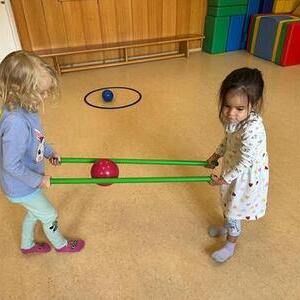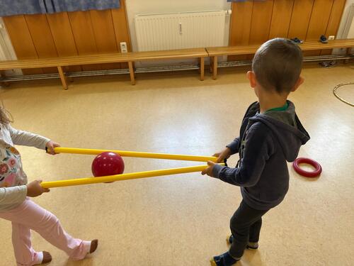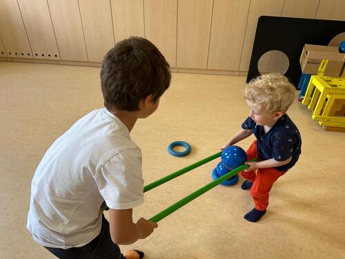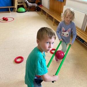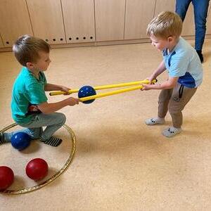 Zur Förderung der Augen-Hand-Koordination erhielten die Kinder die Aufgabe, gemeinsam mit einem Partner einen Softball mithilfe von zwei Stäben (eine/r auf jeder Seite) in einer bestimmten Reihenfolge von Punkt A nach Punkt B zu transportieren – ohne den Ball dabei fallen zu lassen.